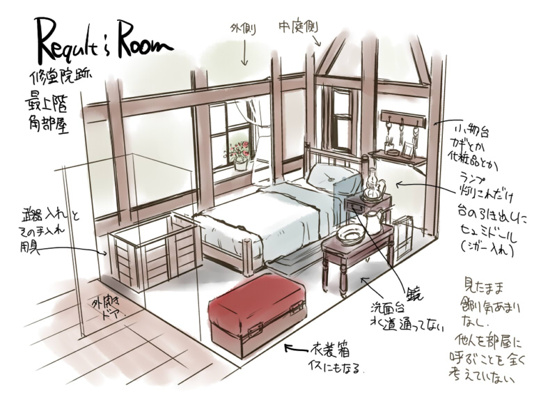 ベッドと壁にもうちょっと隙間があって、座って窓の外とか眺めてんのかも。煙草ふかして。